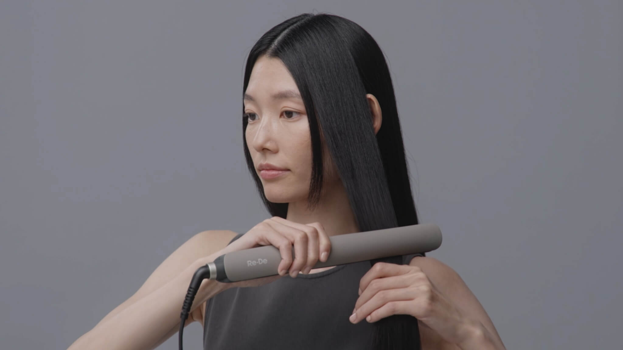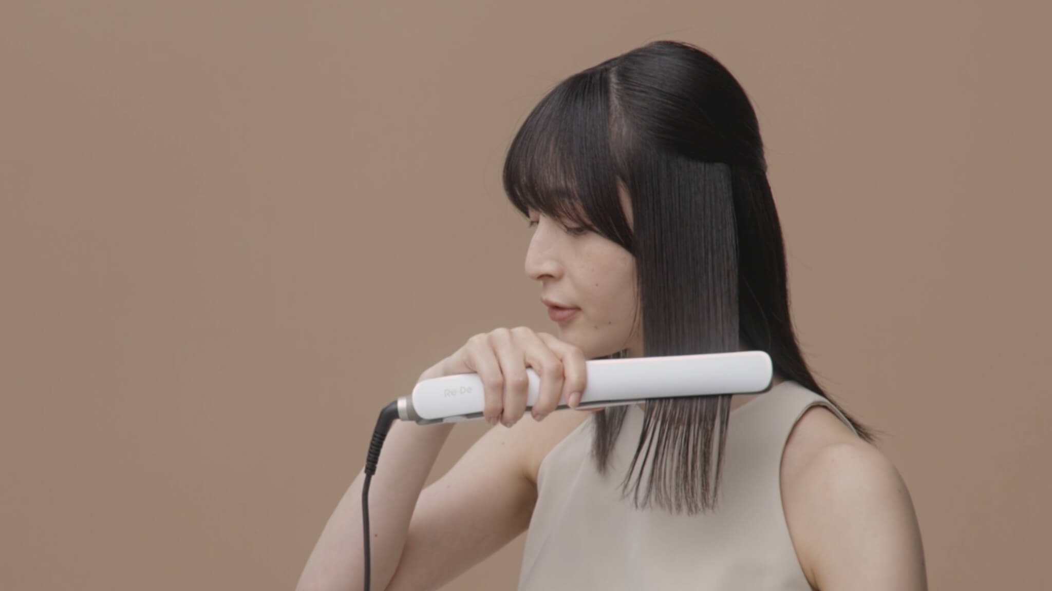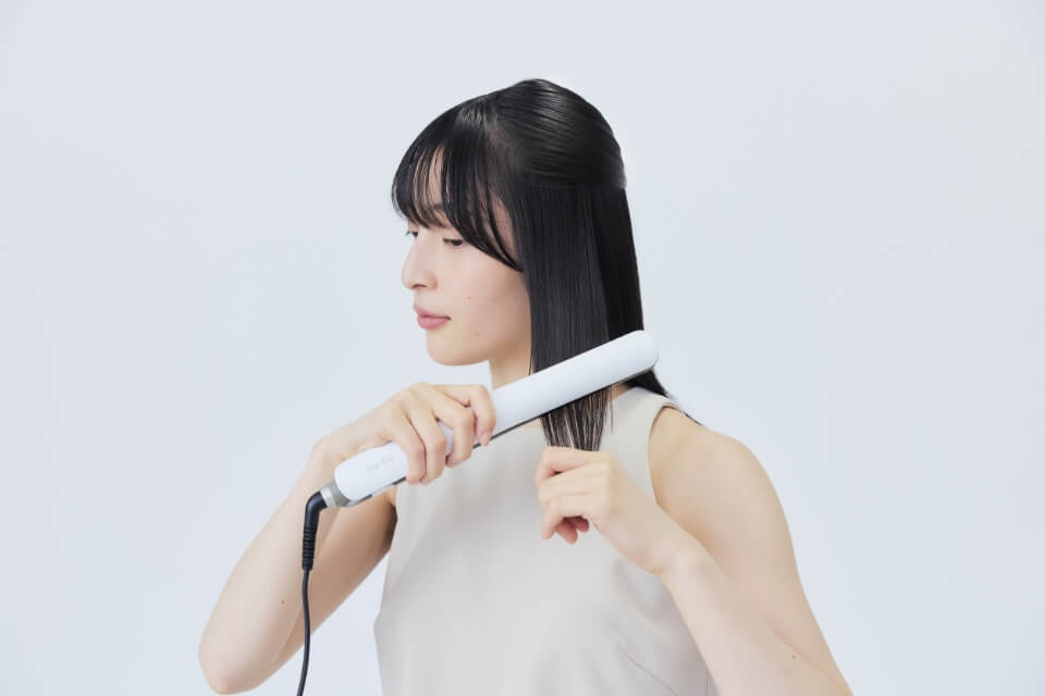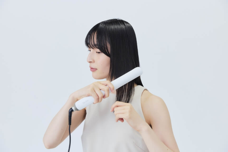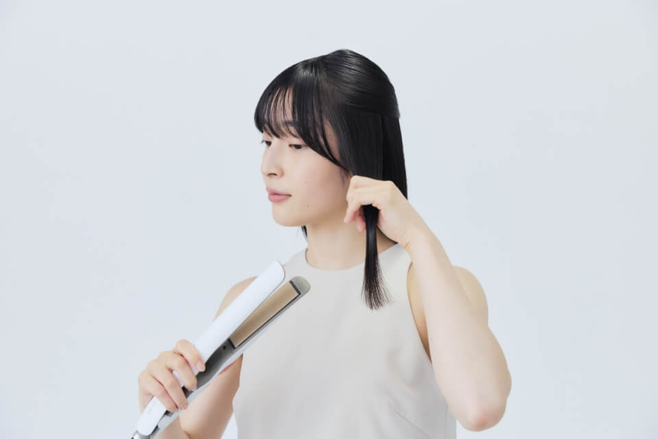 アイロンプレートの中央に毛束をはさみ、